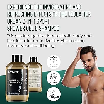 - Invigorating Cleanse: 2-in-1 Sport shower gel and shampoo men, infused with grapefruit oil, tones the skin and lightens the mood, perfect for post-sports refreshment and daily use.
