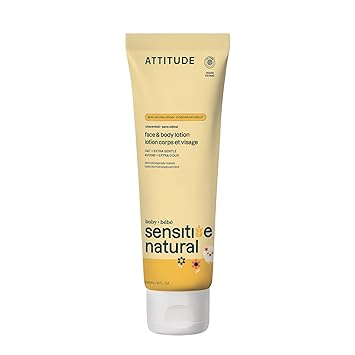 ATTITUDE Sensitive Natural Baby Body Lotion is the perfect everyday baby lotion to nourish and protect delicate skin. Formulated with 98.9% naturally sourced ingredients, this fragrance free baby lotion is enriched with oat extract to soothe discomfort and improve the appearance of dry, damaged, or sensitive skin. Lightweight and non-greasy, it absorbs easily and provides gentle hydration, making it an ideal baby face lotion as well as a body moisturizer. Dermatologically tested and EWG VERIFIED, this unscented baby lotion is fit for sensitive skin. Whether you’re at home or on the go, its convenient size makes it a great travel baby lotion and an essential for any diaper bag. Parents love it as a reliable dry skin cream and part of their clean skin care moisturizers routine. Pair this lotion with ATTITUDE’s baby shampoo or baby soap for the perfect baby soap and lotion set, or combine it with our baby wash for a complete baby wash and lotion routine. It is the perfect match for families looking for an alternative that’s vegan, and worry-free.