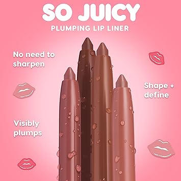 Visibly plump and reshape your lips with our long-lasting plumping lip liner. It delivers the cleanest lines and helps minimize feathering while boosting your lip line for a pouty effect. Plus it’s retractable for an always sharp, versatile application. Infused with plumping Ginger, smoothing Ceramides Peptides and tingling Peppermint. Follow your natural lip line for a subtle juicy look, or overline Cupid’s Bow and bottom center lip for an extra juicy look. You’ll feel a slight tingle - don’t worry, that just means it's working! Wear the lip plumpers alone or top with So Juicy Plumping Gloss Balm or So Juicy Plumping Gloss.