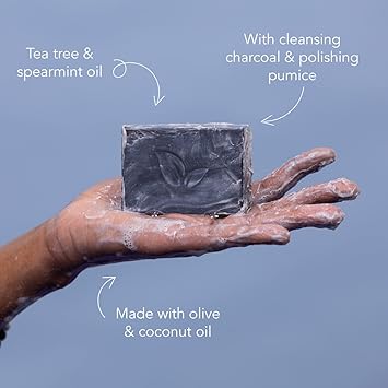 - Got troubled skin? We've got you covered! This body wash bar includes exfoliating pumice, deep cleansing charcoal, and soothing tea tree and spearmint. We use ground pumice in this bar, which is a light and porous volcanic rock, so can be abrasive, we recommend that you apply the product onto skin gently or apply with a loofah.
