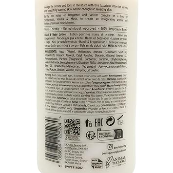Indulge in the luxurious Sandalwood & Vetiver Hand & Body Lotion, crafted with 97% natural essential oils for a truly sensual experience. This quick-drying formula features earthy top notes of Bergamot and Vetiver layered over a sophisticated base of Sandalwood, Vanilla, and Musk, creating an invigorating and nourishing aroma. The 16.9 fl oz lotion locks in moisture to deliver silky soft, beautifully scented skin while being gentle enough for sensitive skin types. This vegan-friendly formula comes in a 100% recyclable bottle and has been dermatologist approved. The rich blend includes nourishing ingredients like Sunflower Seed Oil and Glycerin to provide deep hydration and lasting comfort for both hands and body. Perfect for daily use, this lotion offers a long-lasting fine fragrance while maintaining optimal skin hydration.