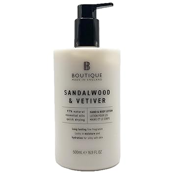 Boutique Sandalwood & Vetiver Hand and Body Lotion, 16.9 Fl Oz, 97% Natural Essential Oils, Quick Drying, Vegan