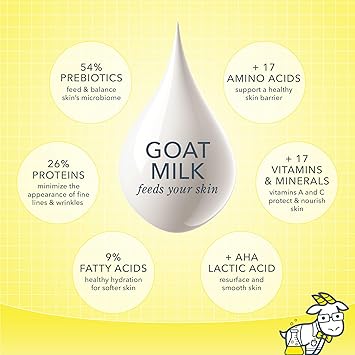 - THE GOAT MILK DIFFERENCE - Rich in lactic acid (a natural exfoliant), vitamins & minerals, goat milk has the same pH as human skin! It helps keep the microbiome well-balanced and prevents visible signs of irritation, sensitivity & premature aging.