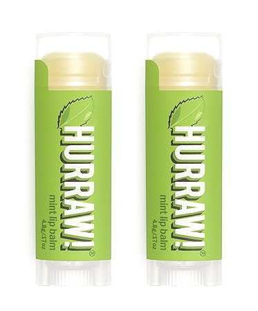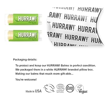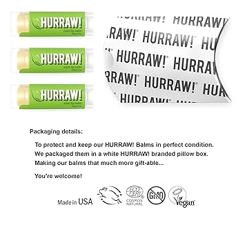 - THREE 4.8g/.17oz Oval Tubes of Mint Lip Balm packaged in a white HURRAW! branded pillow box. Awesome tingle and crisp and a long lasting minty treat for your lips! The icy scent of our mint lip balm reminds us of those 1970's peppermint patty commercials (swoon). Made with certified organic, vegan, and raw ingredients. Hurraw! Lip Balms are certified 100% all natural origin, cruelty and gluten free. Non-GMO. Bee, Shea, Soy and Palm Free.