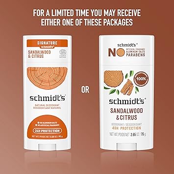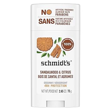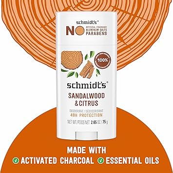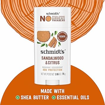 Really Natural. Really Works. Schmidt’s Sandalwood and Citrus is the first Ecocert Certified Natural Deodorant for women and men in the US — Formulated with certified 100 percent natural origin ingredients, natural deodorant without aluminum, certified vegan deodorant by Vegan Action and Leaping Bunny certified cruelty-free. Our natural deodorant formula helps neutralize odor and keep you fresh, enriched with magnesium, and offers all-day 24 hour odor protection while being gentle on skin. Schmidt’s is made with plant-based oils and butters like coconut oil, jojoba seed oil, and shea moisture butter, as well as vitamin E. Luxurious, long-lasting scents made with 100 percent natural origin fragrance are never synthetic, always made with plant isolates and essential oils like tea tree and lavender. All of our Schmidt’s natural deodorant sticks require only a small amount of application for great results. To use, hold the deodorant stick momentarily to skin to soften on contact with body heat. Gently apply a small amount to dry, clean underarms to keep you feeling fresh all day. 1-2 swipes for application are all you need. Do not apply to irritated, damaged or freshly shaved skin. Our vegan deodorant never contains aluminum salts, artificial fragrance, filler ingredients, propylene glycol, phthalates, or parabens.