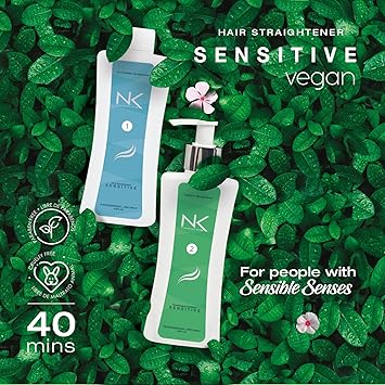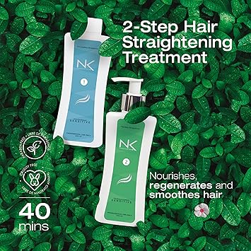 NK Professional Care Sensitive Keratin Hair Straightening Treatment, Vegan, Formaldehyde Free. Kit Steps 1,2,3,4. Sensitive straightening treatment, post-treatment shampoo and restorative mask.