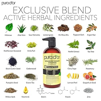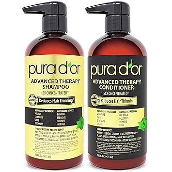 PURA D'OR Advanced Therapy Shampoo and Conditioner Set for thinning hair helps strengthen hair, and minimize breakage. It is one of PURA D'OR's best selling shampoo and conditioner sets because of its extra strength feature that increases volume and thickness of your hair, keeping it moisturized and tangle-free all day long. Our advanced shampoo and conditioner contains 17 key active ingredients in the shampoo and plant-based preservative system, each with twice the concentration to support and ensure a moisturized and healthier hair from roots to tips without any signs of distress, breakage, or leaving it flat. Our Proprietary Herbal Blend with ingredients such as Saw Palmetto, Nettle extracts, Biotin, He Shou Wu, Red Korean Seaweed, Pygeum Bark Extract, and other exotic herbs to combat signs of hair thinning are part of the proprietary blend. Even with the double concentration formula, our sulfate-free shampoo and conditioner is still safe for our daily routine use on any hair types including natural hair, colored treated or dry and damaged hair, for both men and women. It is free from harsh chemicals and paraben-free. It is hypoallergenic, vegan, environmentally responsible, and cruelty-free.