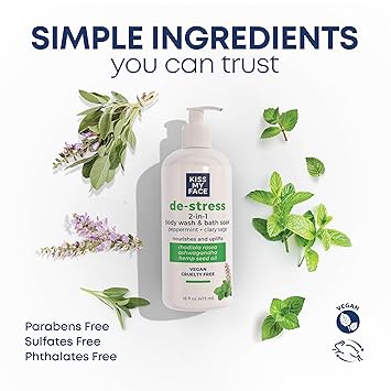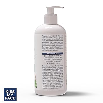 Kiss My Face 2-in-1 Body Wash Body Soak gently cleans and delivers comforting nourishment while helping improve skin's moisture retention. Infused with soothing Rhodiola Rosea and Hemp Seed Oil and adaptogenic Ashwagandha. Pamper your body and mind with a delicate lather and calm scent for your shower or bath. Relax during your bath or shower with the fragrant scents of Peppermint and Clary Sage Oils. Clean and cruelty free since 1983. With With no parabens or phthalates, no sodium lauryl/laureth sulfates, no artificial colors, and no mineral oil or formaldehyde donors.