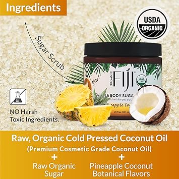- The Best Exfoliating Experience : Organic Fiji Sugar scrubs serves as a body scrub, face scrubber, hand scrub or foot scrub ! Organic Fiji whole body scrub comes with Raw, Organic, Island Cane Sugar to exfoliate the skin and remove dulling, dead skin cells and Raw, Organic, Cold-Pressed Coconut Oil to deeply moisturize and rejuvenate the skin.