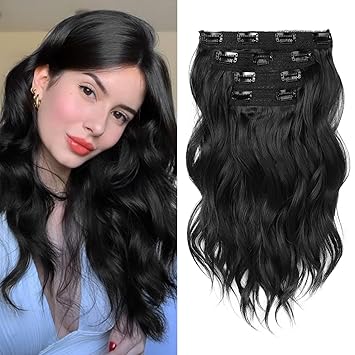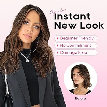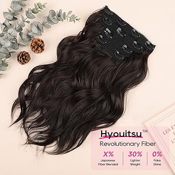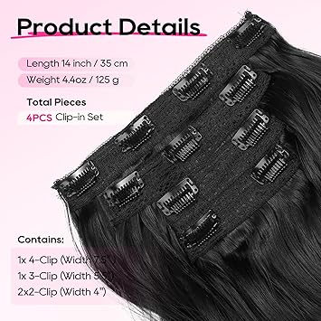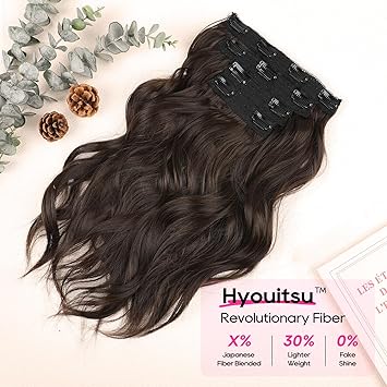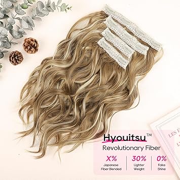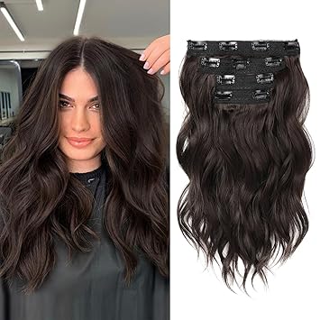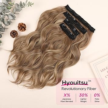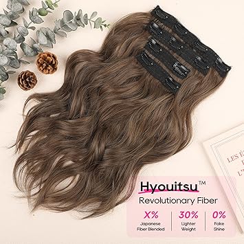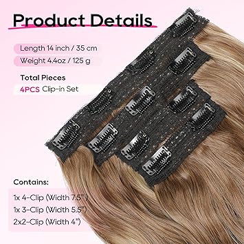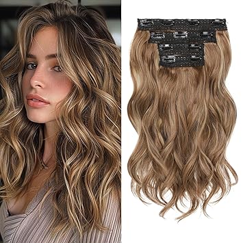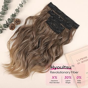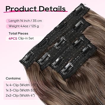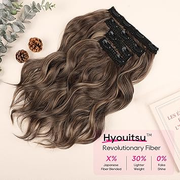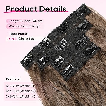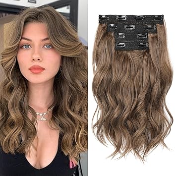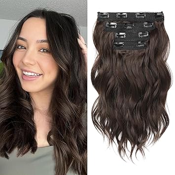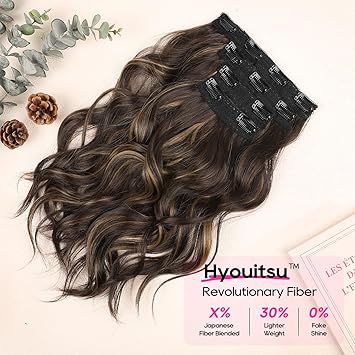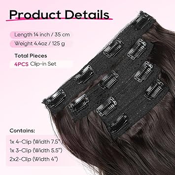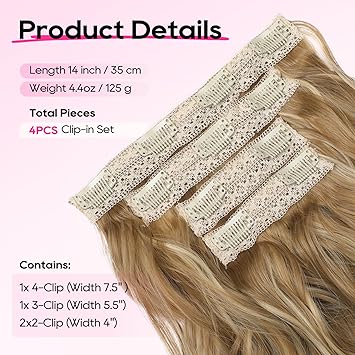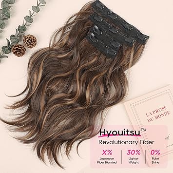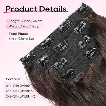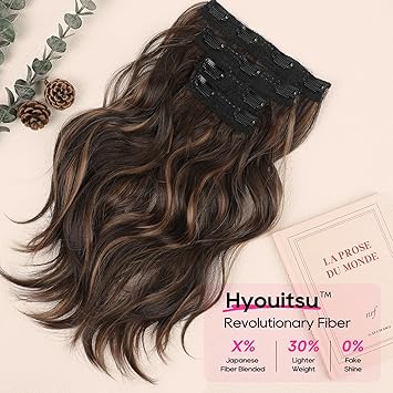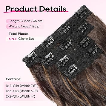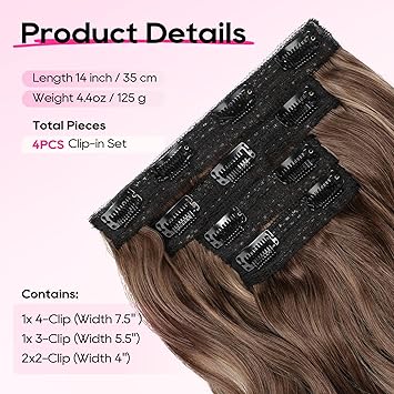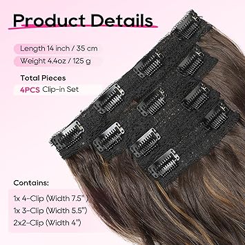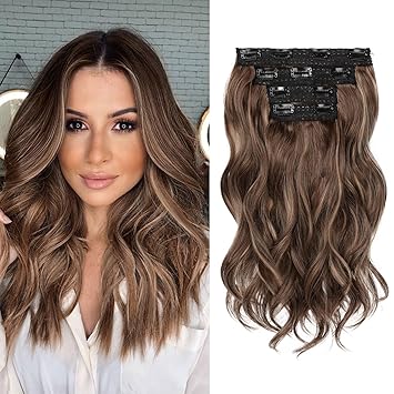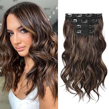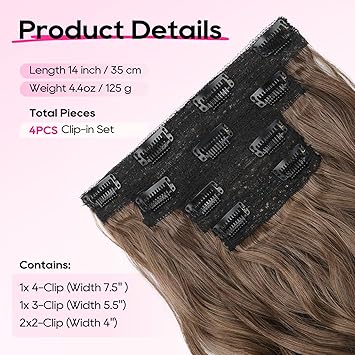 REECHO Hair Extensions, 4PCS Clip in Hair Extensions 14" Short Beach Wavy Hair Extensions Invisible Lace Weft Natural Soft Hairpieces for Women - Chestnut Brown with Highlights