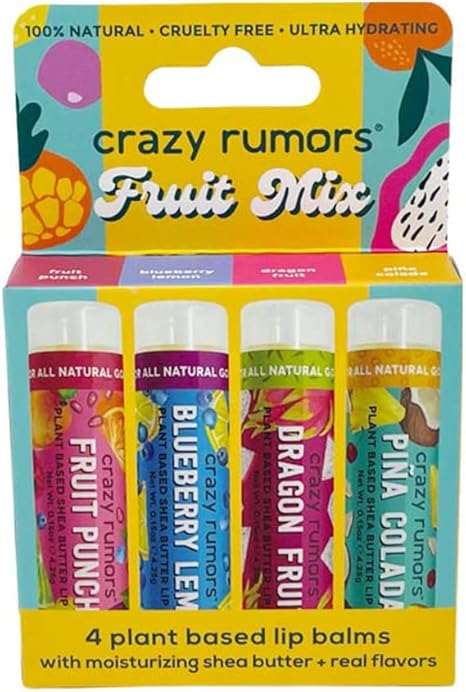 - ️ FOUR Lip Balms in 0.15oz Eco-Conscious Tubes of Crazy Rumors Fruit Flavors: Fruit Punch, Blueberry Lemon, Dragon Fruit + Piña Colada