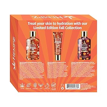 Set includes two limited-edition lotions, Spiced Pumpkin Pie & Caramel Candy Apple, both 2.25 fluid ounces in flip-top bottles, and a Spiced Pumpkin Pie Lip Balm, 0.44 fluid ounce.