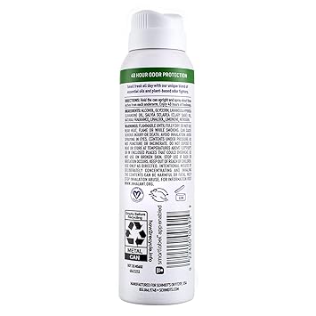 Stay fresh with Schmidt's Natural Deodorant Spray, a formula that's 99.89 percent of natural origin, non-GMO, certified cruelty-free and vegan, and made without aluminum salts. All the ingredients in our deodorant spray are sourced from plants or air (e.g. nitrogen). Our effective odor-protecting formula helps keep you fresh all day long in a Rose and Vanilla scent from a unique blend of essential oils and plant-based odor fighters in the convenience of a deodorant spray that leaves no visible residue or white marks. This first-of-its-kind deodorant spray harnesses the power of compressed air, not greenhouse gasses, for an ozone-friendly propellant. A product made for everyone, women and men, this vegan deodorant spray made with glycerin, known for its skin-soothing benefits, applies easy and dries quickly. (Application Tip: If it's taking too long to dry, you may be applying too much.) How to apply: Hold the can upright, spray 3-inches from underarms, and enjoy 48 hours of freshness. Standard aerosol propellants require you to shake the can to mix the product with the propellant. Our nitrogen propellant doesn't require mixing, so there is no need to shake the can before application. While our formula is made without aluminum salts, the container is aluminum metal, which is infinitely recyclable and can be recycled anywhere aluminum is accepted.