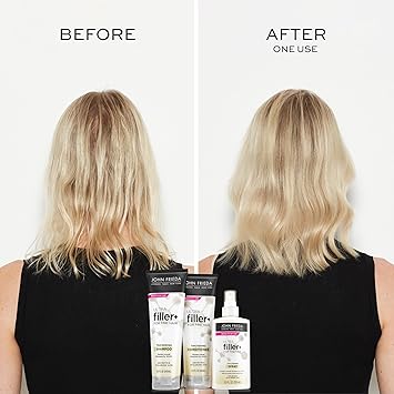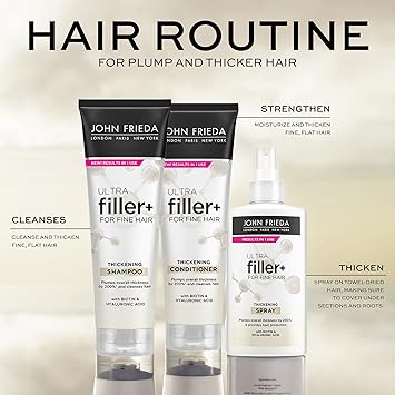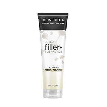 Instantly get the look and feel of more hair. Infused with biotin and hyaluronic acid, this thickening conditioner visibly plumps, leaving you with thicker, fuller and more nourished hair in only one use! Our hair volume conditioner plumps the overall thickness of your hair by 200%* and nourishes your hair, reducing hair loss due to breakage (*when using ULTRAfiller Shampoo, Conditioner & Spray vs. basic shampoo). Our John Frieda ULTRAfiller technology strengthens your hair, adding manageability to fine, fragile hair while boosting overall hair thickness and plumpness. How? It aligns and creates spaces between hair fibers, resulting in a thicker look and feel. Give fine, flat hair an instant thickening boost with this silicone-free and vegan friendly volumizing conditioner. To use, work our volumizing shampoo gently through wet hair, lather and rinse well. Try the full John Frieda PROfiller thickening line, which is a 3-step process. Together, all three products complement each other for the best thickening results. Step 1 is to cleanse with our thickening shampoo that visually plumps in only one use. Step 2 is to strengthen as you condition, helping to align the hair and creating thickness with our John Frieda ULTRAfiller conditioner for thinning hair. Step 3 is to thicken with our thickening spray, which plumps all over and provides heat protection for fragile hair. Try them all today for thicker, bouncier, more resilient hair.