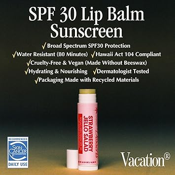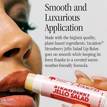- SMOOTH AND LUXURIOUS APPLICATION - Made with the highest quality, plant-based ingredients, Vacation Strawberry Jello Salad Lip Balm with SPF 30 goes on smooth while keeping its form thanks to a coveted warm-weather-friendly formula