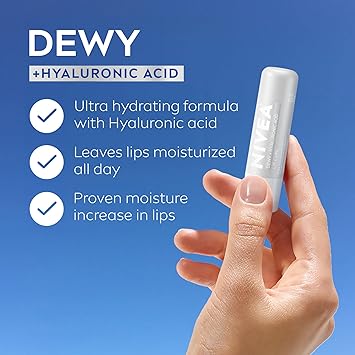 NIVEA Dewy Lip Care with Hyaluronic Acid gives lips a noticeable moisture boost, leaving them feeling soft and smooth with a dewy lip look. NIVEA Dewy Lip Care lip balm has an evolved, ultra-hydrating formula enriched with Hyaluronic Acid, to help reduce water loss and leave lips moisturized all day long. Hyaluronic Acid, when combined with glycerin, is a highly effective moisturizing complex, and the NIVEA Dewy Lip Care lip moisturizer formula leaves lips looking dewy and feeling soft. With a light, non-sticky feel, this hydrating lip balm glides on smooth without a waxy feel, and leaves lips looking dewy and with visibly less noticeable lip lines. This NIVEA lip balm delivers soft lips instantly and long-lasting lip hydration. NIVEA Dewy Lip Care is a vegan lip balm stick made with no animal derived ingredients. Apply this hydrating lip balm to lips throughout the day for the ultimate lip care. NIVEA is a trusted leader in skin care products, with more than 130 years of expertise.