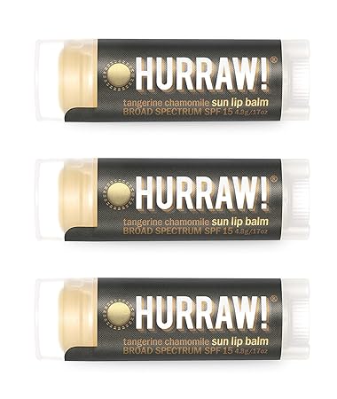 - THREE 4.8g/.17oz Oval Tubes of Sun Lip Balm (Tangerine, Chamomile) packaged in a white HURRAW! branded pillow box. Our zinc oxide broad spectrum SPF 15 Sun Balm can offer your lips extra protection. Glides on silky smooth & formulated to be extra thick and creamy for longer staying power while out in those shining rays! Made with certified organic, vegan, and raw ingredients. Hurraw! Lip Balms are certified 100% all natural origin, cruelty & gluten free. Non-GMO. Bee, Shea, Soy and Palm Free.