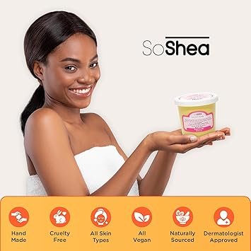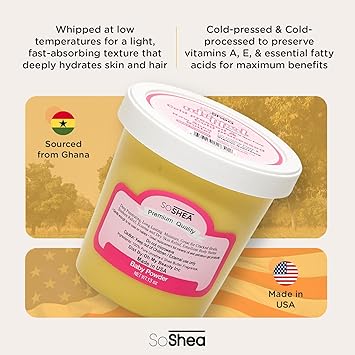 So Shea Whipped Shea Butter is designed to deeply nourish and rejuvenate your skin. Made with 100% Premium-Grade shea butter from Ghana, it promotes a healthier and more radiant complexion. The whipped texture makes it easy to apply, allowing for quick absorption without any greasiness, providing lasting hydration. Dermatologist-approved and suitable for sensitive and eczema-prone skin, whipped shea butter is also vegan-friendly, free from mineral oil, parabens, phthalates, and dyes. Proudly made in the U.S.A., So Shea offers high-quality, natural products that have been trusted for generations. Embrace the nourishing power of premium-grade shea butter and turmeric for superior moisturization and a glowing look.