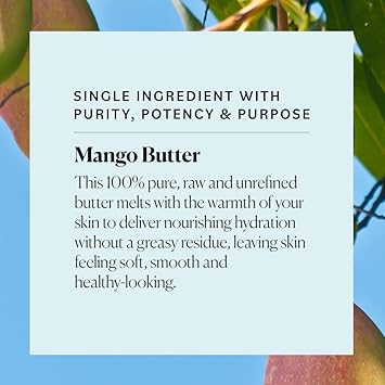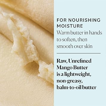 - NOURISHING BUTTER: 100% pure, raw and unrefined, this uniquely textured Mango Butter transitions from a balm to a quick-absorbing oil as it is rubbed in, leaving skin feeling soft, smooth, nourished and not greasy