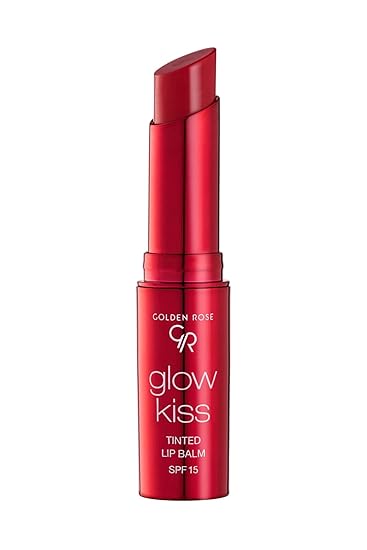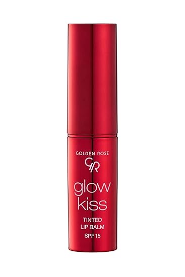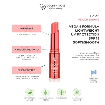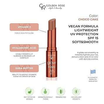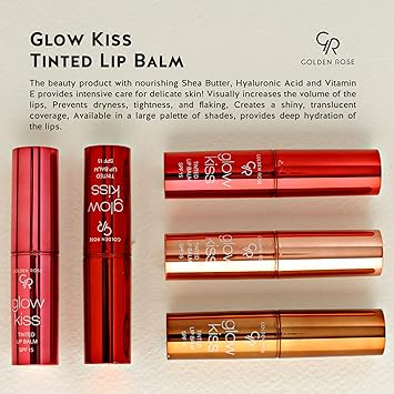 Golden Rose Cosmetics Glow Kiss tinted chapsticks with SPF15, Clean vegan shimmer sunscreen revitalizing lip balm sheer shimmer formula with 6 fresh shades and flavors. Vanilla Latte, Strawberry, Peach Shake, Choco Cake, Cherry Juice and Berry Pink. Soft, rich, vegan formula is infused with Shea Butter, Hyaluronic Acid baby lips lip balm, and Vitamin E to nourish and drench lips with hydration and plumber.