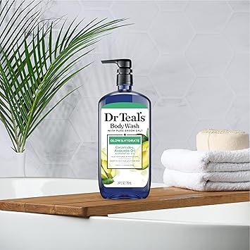 Hydrate and cleanse like never before with Dr Teal’s Glow & Hydrate Body Wash with Avocado and Pure Epsom Salt. Avocado oil deeply moisturizes to leave your skin glowing and radiant after bathing. Pure Epsom Salt helps rejuvenate the skin and ease sore muscles. Our unique blend of essential oils helps soothe your mind. Feel refreshed and ready to face the day with this nourishing body wash. Mix with your favorite Dr Teal’s Pure Epsom Salt Soaking Solution to create an exfoliant. Dr Teal’s products are vegan and cruelty-free and contain no harsh ingredients such as parabens and phthalates.
