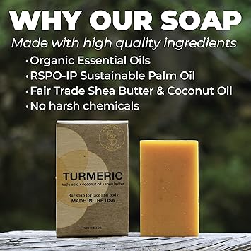 - Made With Purpose: Our soap features Turmeric and Kojic Acid, combined with Coconut Oil and Shea Butter, designed to leave your skin feeling smooth and soft. This thoughtful blend is perfect for those seeking a gentle and natural soap