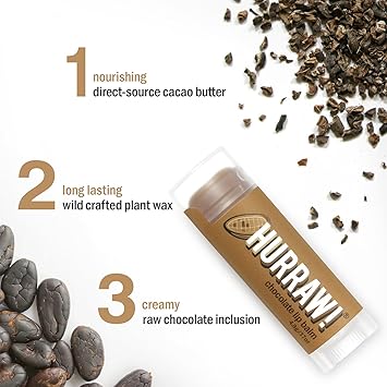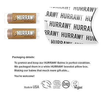 - TWO 4.8g/.17oz Oval Tubes of Chocolate Lip Balm packaged in a white HURRAW! branded pillow box. Unsweetened, raw chocolate is in the house! It won't leave any color on your lips but the creamy, "tootsie-rollish" chocolatey-ness will soothe your cravings! Choco. Love. Made with certified organic, vegan, and raw ingredients. Hurraw! Lip Balms are certified 100% all natural origin, cruelty and gluten free. Non-GMO. Bee, Shea, Soy and Palm Free.