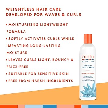 Introducing Cantu Weightless Smooth Curl Cream, specially formulated for waves and loose curls. Our Weightless Smooth Curl Cream softly activates curls while imparting long-lasting moisture. Made with organic fair trade blue agave extract, an ingredient known to help promote stronger, smoother, healthier looking hair. Squalane, meadowfoam and macadamia help to moisturize hair strands and leaves curls light, bouncy and frizz-free. This styler is vegan and safe for sensitive skin and free from harsh ingredients. Cantu Weightless is vegan, suitable for sensitive skin, and free from harsh ingredients.