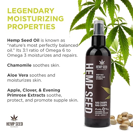 Hemp Seed Body Mist - 8 fl oz - Moisturizes, Invigorates & Protects Skin - With Hemp Seed Oil, Chamomile & Aloe Vera - Vegan, Cruelty Free
