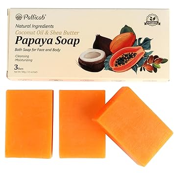 Natural Papaya Bar Soap, Exfoliating & Moisturizing, Tea Tree Oil & Coconut Oil, Shea Butter, Papaya, Lemon Essential Oil - Vegan, with Purple Foaming Net, 3 Bars