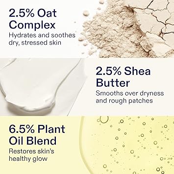 - INGREDIENTS - 2.5% Oat Complex soothes dry, stressed skin. 2.5% Shea Butter smooths over dryness and rough patches. 6.5% Plant Oil Blend restores skin's healthy glow.