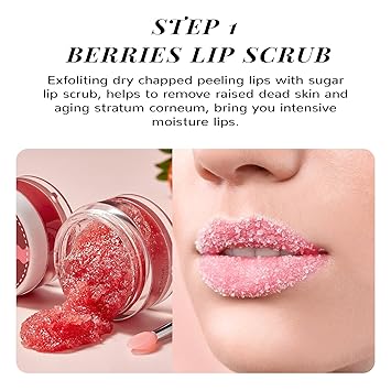 - NATURAL INGREDIENTS -- A variety of natural vegan antioxidants such as Hyaluronic Acid, Jojoba Seed Oil, Crocus Sativus Root Extract, and Blueberry Fruit Extract naturally moisturise your lips! Our Lip Care Kit instantly exfoliates and repairs your lips overnight, providing you with total care.