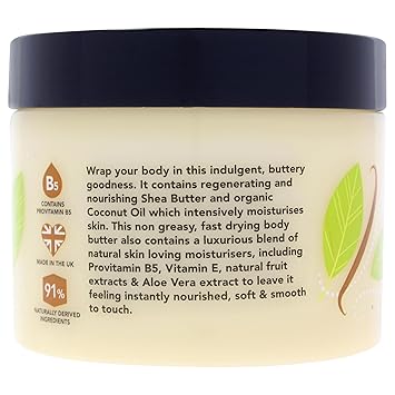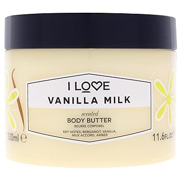 Shop the I LOVE Vanilla Milk Scented Body Butter for an indulgent hydration experience. This ultra-hydrating body cream formula wraps your body in luxurious moisture, with no greasy residue. Infused with coconut oil, shea butter, provitamin B5, Vitamin E, Aloe Vera, and natural fruit extracts, this non-greasy body butter leaves your skin soft to the touch. Enjoy the soothing fragrance of bergamot, vanilla milk accord, and amber, creating a warm and comforting aroma that lingers on your skin. Prioritize your self-care routine with I LOVE, where all our bath and body products are carefully formulated with natural ingredients to nourish your skin and enhance your well-being. Crafted in the UK, our vegan and cruelty-free formulas are free from harsh chemicals, parabens, petroleum-based ingredients, phthalates, and SLS. Elevate your self-care routine with I LOVE Vanilla Milk Scented Body Butter and indulge in luxurious hydration and delightful fragrance.