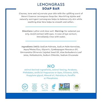 The Desert Essence Organic Lemongrass Bar Soap is a gentle, naturally scented face and body soap that helps skin retain its natural moisture. With ingredients like jojoba oil and aloe vera, this bar soap moisturizes and softens the skin leaving it smooth and silky to touch. The astringent properties of lemongrass oil uplifts the senses while revitalizing skin for a refreshing feel. This moisturizing soap has a luxuriously creamy texture, thus works great for dry skin and flakiness, thus improving skin clarity, elasticity and texture. This organic lemongrass bar is made using 100% sustainably harvested palm oil, which complies with the standards set by the Roundtable on Sustainable Palm Oil (RSPO).