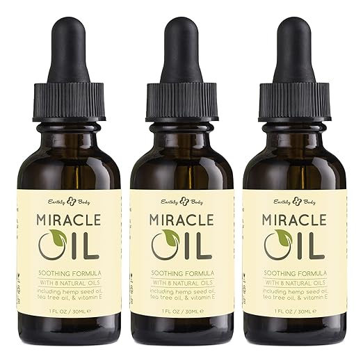 Earthly Body Miracle Oil, 1 fl. oz. - 3 Pack - 100% Natural Tea Tree Oil, Hemp Seed Oil & Vitamin E - Moisturizer, Calms Skin Irritations, Helps Smooth Wrinkles - Gluten Free, 100% Vegan