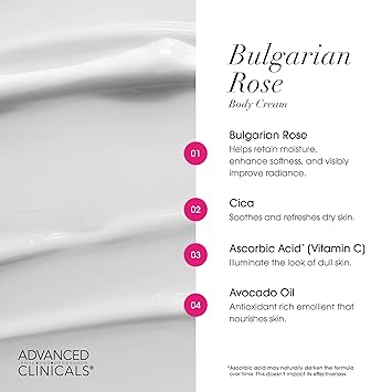 - BULGARIAN ROSE BODY LOTION WITH CICA, ALOE VERA, & VITAMIN C - Hydrates and softens skin while supporting moisture retention. This blend helps visibly, improve texture, and promote a smoother, more radiant-looking appearance. Helps moisturize and visibly even skin tone, reducing the appearance of dark spots & dull, uneven looking skin.