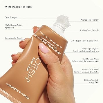 - Cleanse and exfoliate in one step with our 2-in-1 Exfoliating Body Wash Neroli & Patchouli. It gently removes dry, rough patches with sugar crystals, AHAs, and botanical oils for smooth skin.