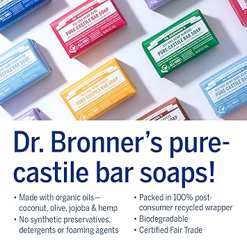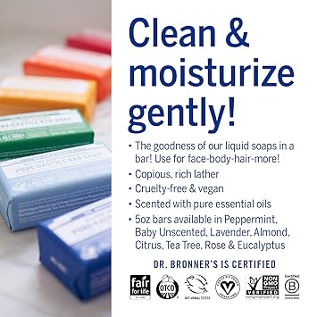 - MOISTURIZING LATHER THAT WON'T DRY YOUR FACE, BODY, OR HAIR: Our bar soaps produce a rich lather that won't dry out your skin! Dr. Bronner's is made with only the purest certified organic oils and will leave your skin feeling soft & smooth.