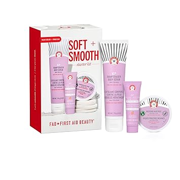 First Aid Beauty Soft + Smooth Starter Body Kit: KP Bump Eraser Body Scrub, 4 oz, Smoothing + Brightening Lotion (Peach), 1oz, & Ingrown Hair Pads, 28 Pads, Exfoliation & Hydrating Skin Care Set, 3ct