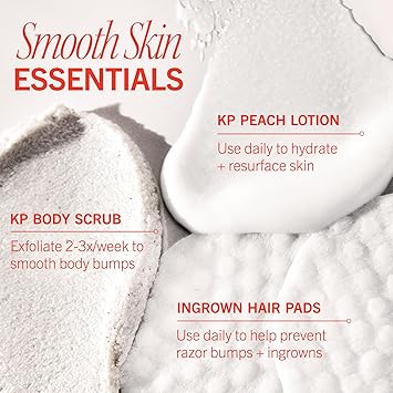 Get touchable, healthier-looking skin with this body-smoothing routine. Exfoliate 2-3 times a week using KP Bump Eraser Body Scrub. On non-scrub days, hydrate resurface skin using KP Smoothing Body Lotion (in new Fresh Peach scent!). Help prevent razor burn ingrown bumps with Ingrown Hair Pads