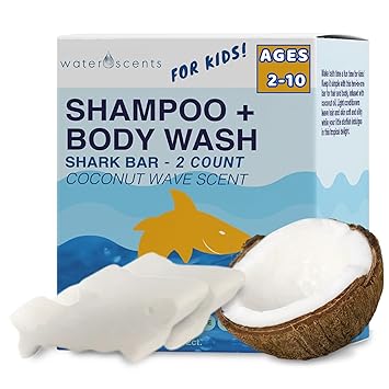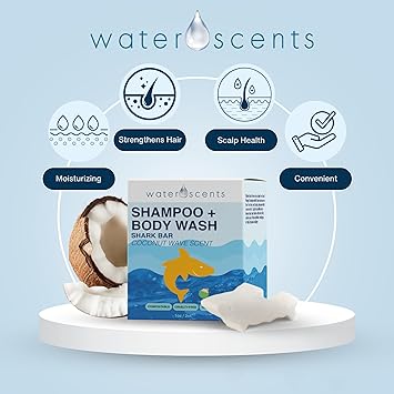Water Scents 2-in-1 Shark Bar Shampoo & Body Wash - Coconut Wave | Natural, Vegan, Moisturizing Bar Soap for Hair & Skin | Solid, Travel-Friendly, USA Made | 1-Pack