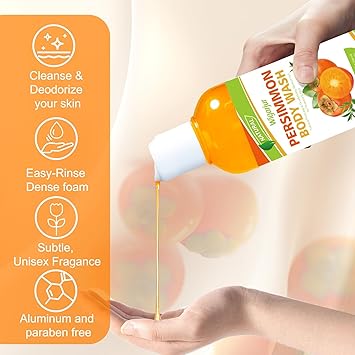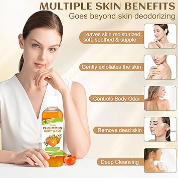 - GENTLE & HYDRATING: Enriched with persimmon, our body wash gel offer more than cleanliness. A non-drying solution, it effectively combats body odor, providing a soothing touch for clean and odor-free skin. Our deodorizing soap with persimmon is non-drying, maintaining its gentle nature, including a Deodorant body wash for added freshness