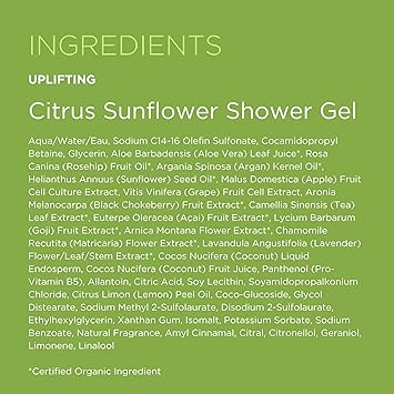 Andalou Naturals Body uplifting shower gel, citrus sunflower, refreshing lavender thyme, organic aloe Vera and gentle cleansing botanicals freshen, vitalize and moisturize for soft, healthy skin. We champion Certified Organic, Natural Origin, BioActive, Fair-Trade, Verified Gluten-Free, Non-GMO Project Verified, Vegetarian and Vegan Ingredients, Eco-Friendly Practices, and a Meaningful No Animal testing Policy. Body care with Fruit Stem Cell Science renews skin at the cellular level, blending nature and knowledge for healthy radiance and vitality.