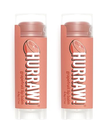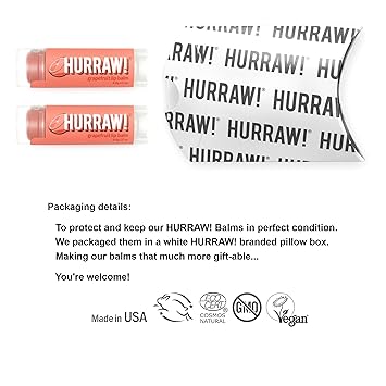 - TWO 4.8g/.17oz Oval Tubes of Grapefruit Lip Balm packaged in a white HURRAW! branded pillow box. Zesty fresh! Let our pink grapefruit balm invigorate your zenses. Possessing a beautifully pink in-tube appearance but only a clear gloss is left on the lips. Made with certified organic, vegan, and raw ingredients. Hurraw! Lip Balms are certified 100% all natural origin, cruelty and gluten free. Non-GMO. Bee, Shea, Soy and Palm Free.