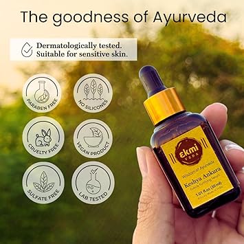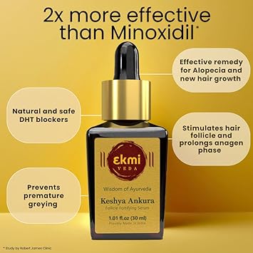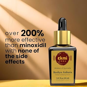 Introducing Ekmiveda's Overnight - Keshya Ankura Follicle stimulating serum (1.01 fl.oz, 30 ml). Infused with Rosemary, Licorice Root with plant-based Redensyl and Capila Longa prolong anagen phase and reactivate follicles while inhibiting DHT production. Blend of ayurvedic hebs such as Brahmi, Bringraj promote scalp health and hair follicles, and Amla nourishes the hair shaft leading to fuller and thicker hair over time. Best holiday hair care product for holistic scalp and hair nourishment. Great choice for gifting as well.