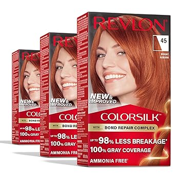 Revlon ColorSilk with Bond Repair Complex, Permanent Hair Color, 100% Gray Coverage, Ammonia Free Dye, Vegan Keratin, 45 Bright Auburn, 3 pack