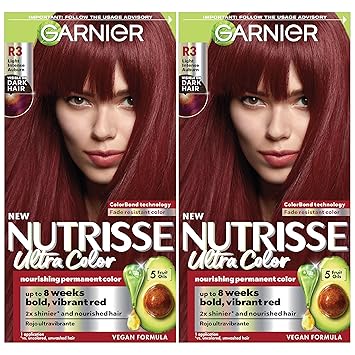 Garnier Hair Color Nutrisse Ultra Color Nourishing Creme, R3 Light Intense Auburn (Red Hibiscus) Permanent Hair Dye, 2 Count (Packaging May Vary)
