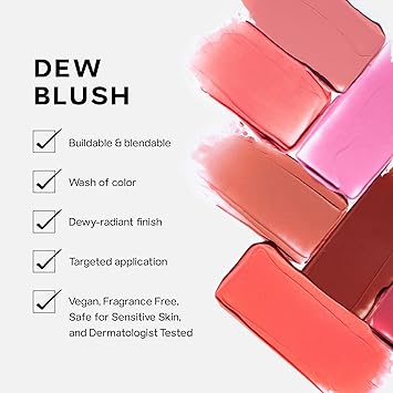 - Dew Blush is a vegan, liquid blush for cheeks that gives a natural flush of just-pinched color with a creamy, radiant finish. It comes with a chubby doe-foot applicator and lightweight formula that lets you create a natural cheek tint (or build up this glow blush for a deeper wash of color).