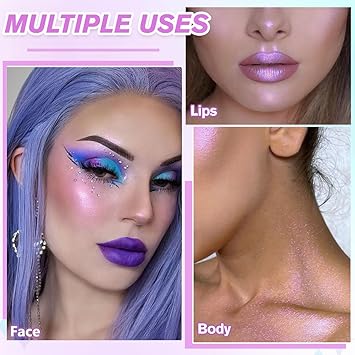 - 【Sparkly Highlighter Makeup】The purple duo chrome shimmer face body highlighter makeup have diffrent color in other angle, light and flawless glow, giving a beautiful natural glow. It can make you more charming and bling, instantly enhances your overall face look for a three-dimensional finish. Can create light a bright and clear make-up,making you glowy up.