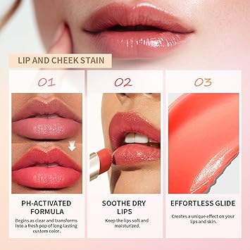 - Ph Lip and Cheek Stain: Transformative, pH-activated lip and cheek stain tint. Rich in natural botanical oils that help to retain moisture. Starts clear and transforms into a fresh pop of long-lasting custom color. Color develops and evolves in response to changes in pH.